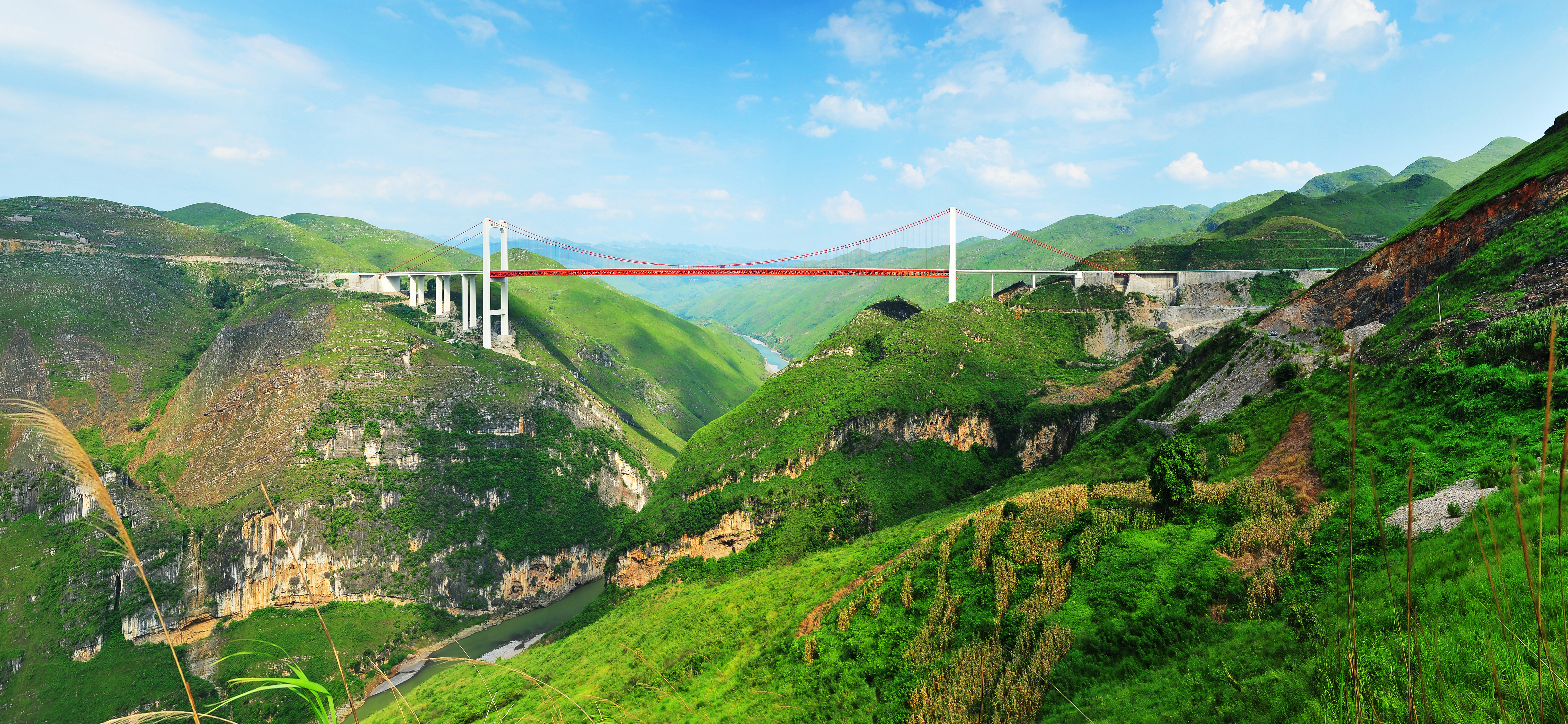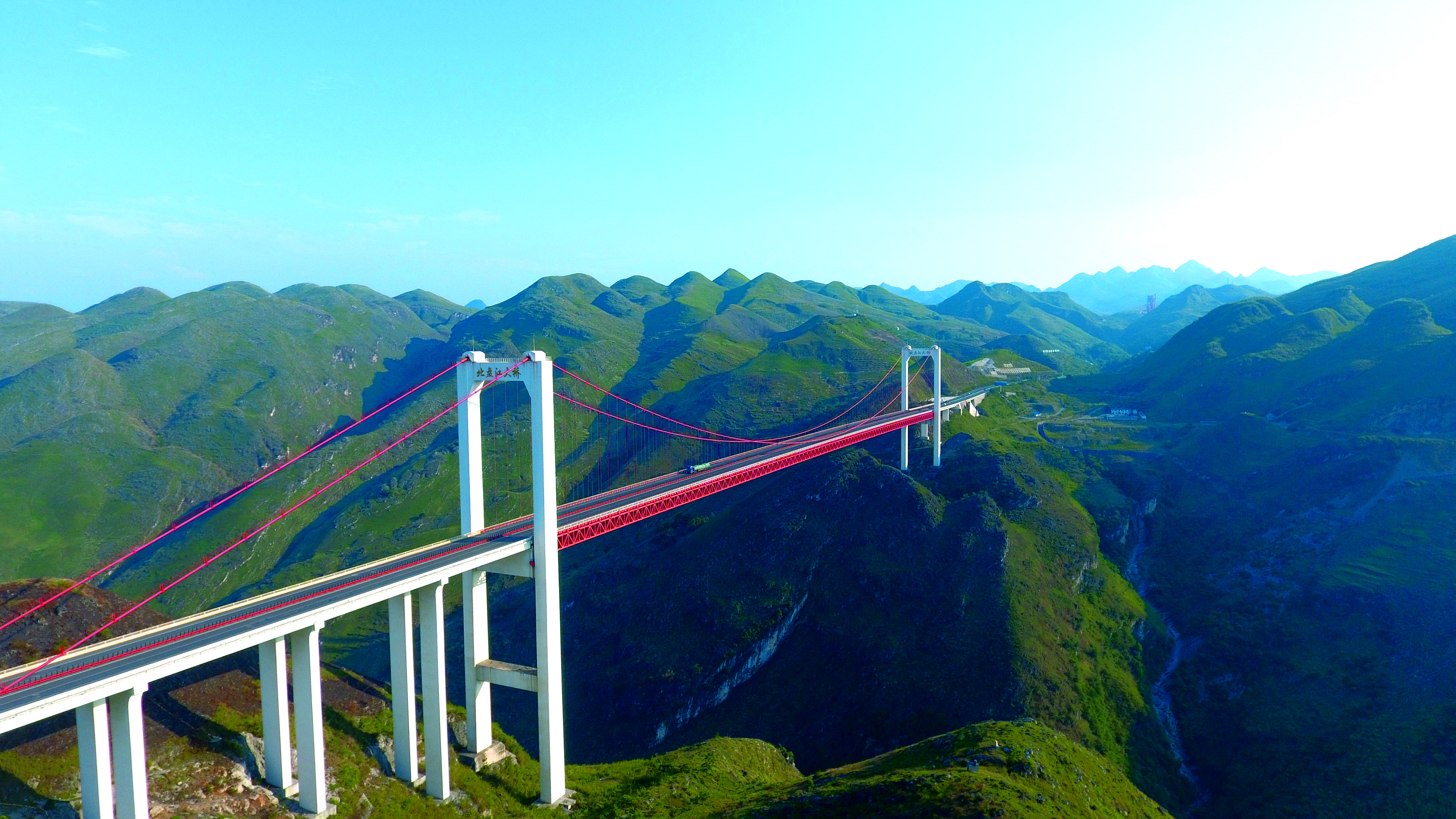 鎮(zhèn)勝高速公路北盤江特大橋,其主跨為636m單跨雙鉸鋼桁加勁梁懸索橋。主梁和橋面板安裝均采用纜索吊裝施工工藝,160T吊重和636m吊跨在建設(shè)時為國內(nèi)之最,指引了千米級纜吊的設(shè)計與施工。大橋于2009年12月23日建成通車。