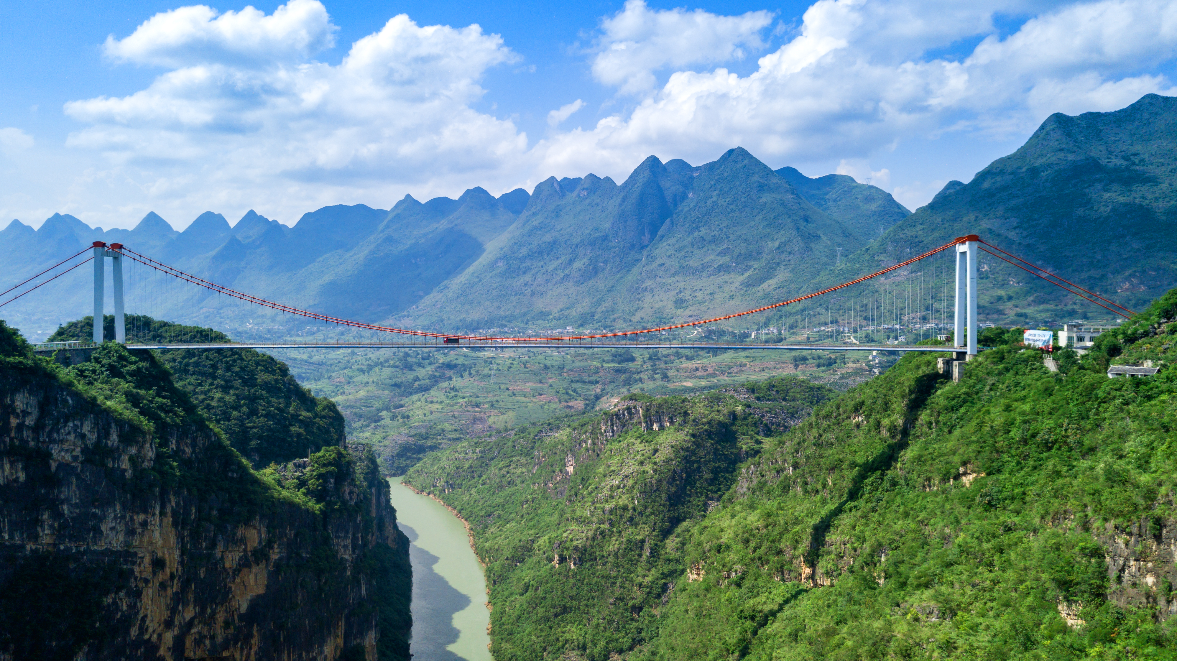 關(guān)興公路北盤江特大橋,主跨為388m雙向預(yù)應(yīng)力混凝土加勁板梁,建成時(shí)為國內(nèi)同類型橋梁最大跨度。此橋橫穿號稱“世界大裂縫”的花江大峽谷,橋面至江面高差超400m,是目前世界上最高的橋梁之一。大橋于2003年12月31日建成通車。